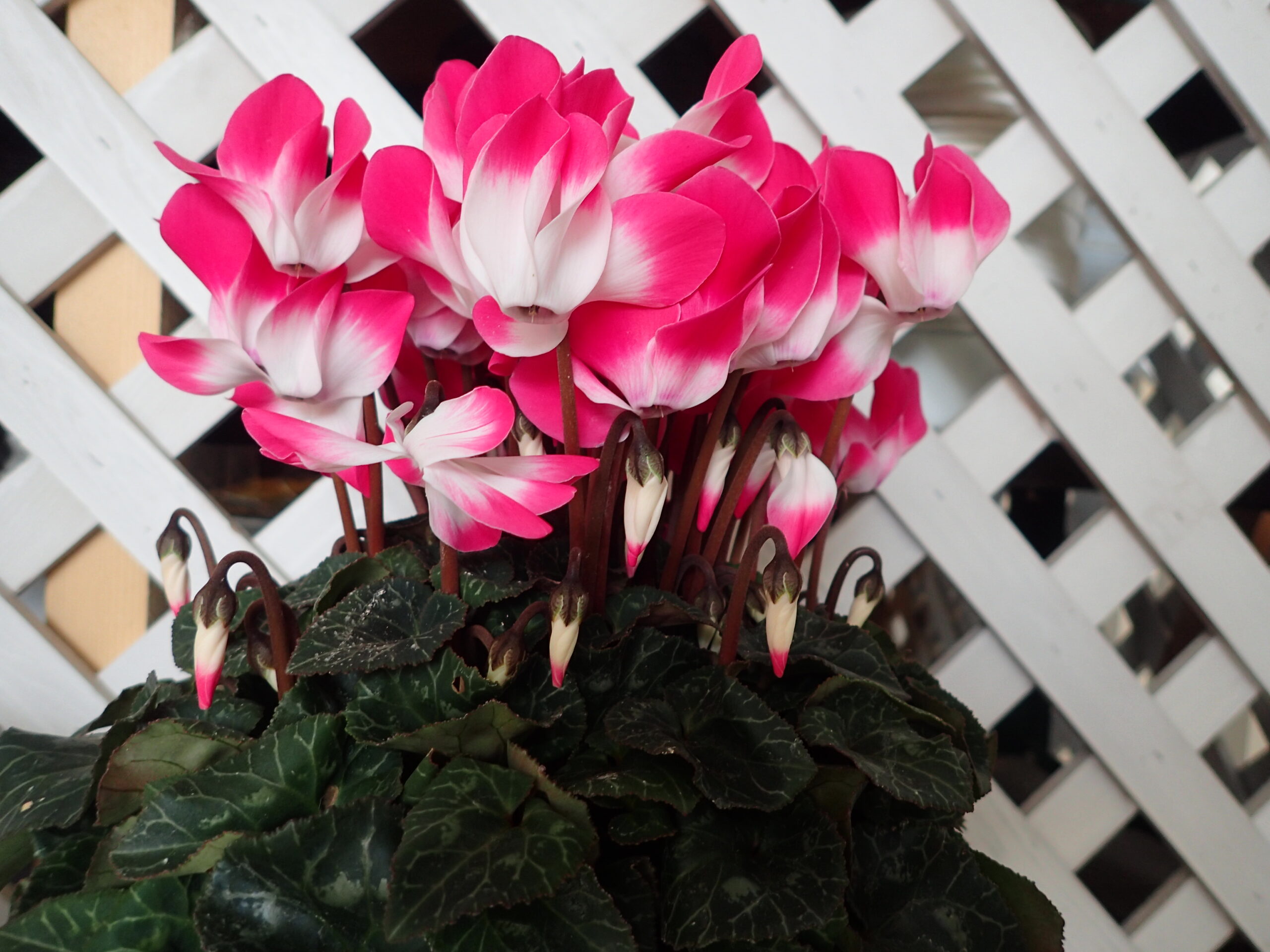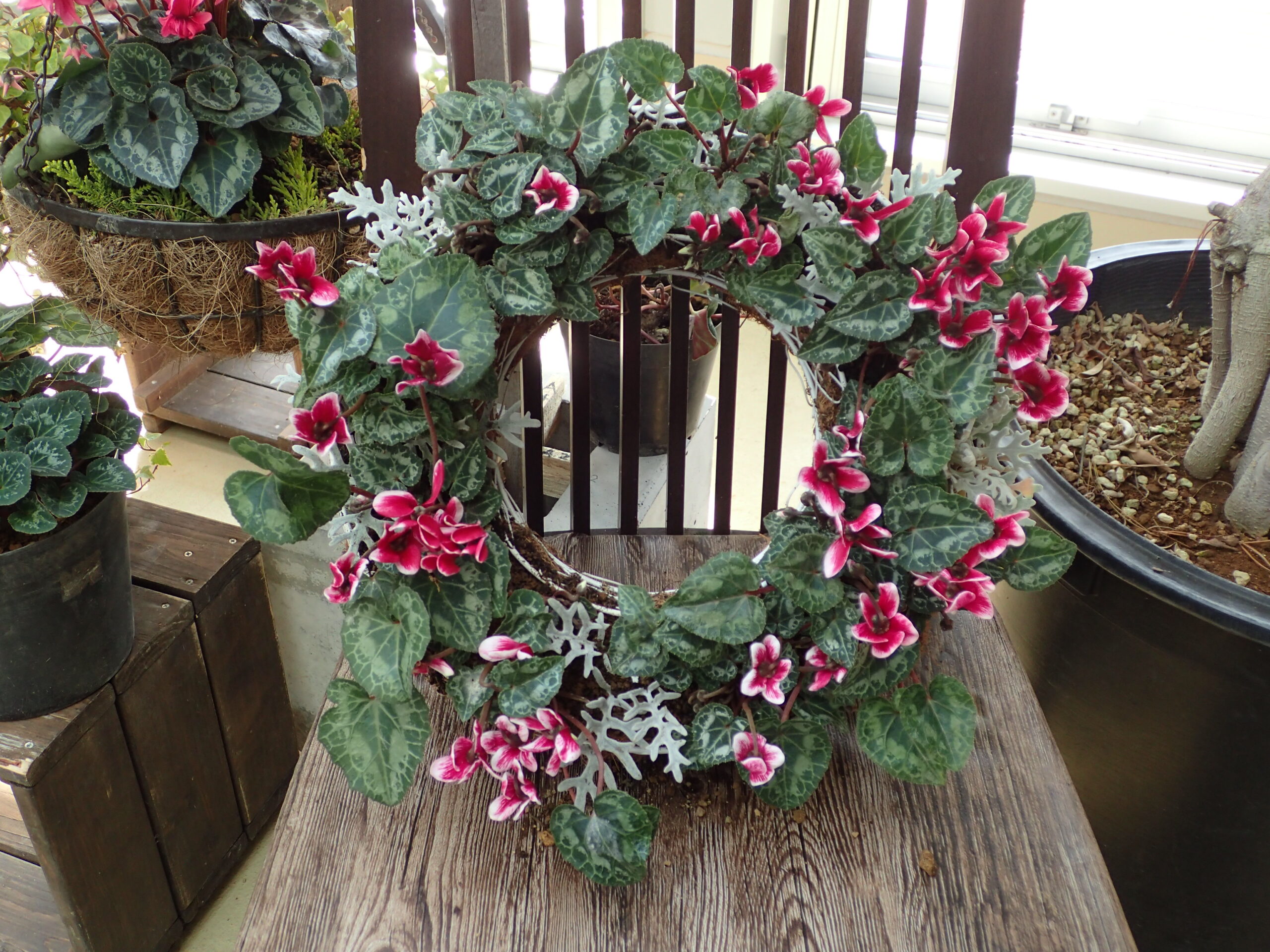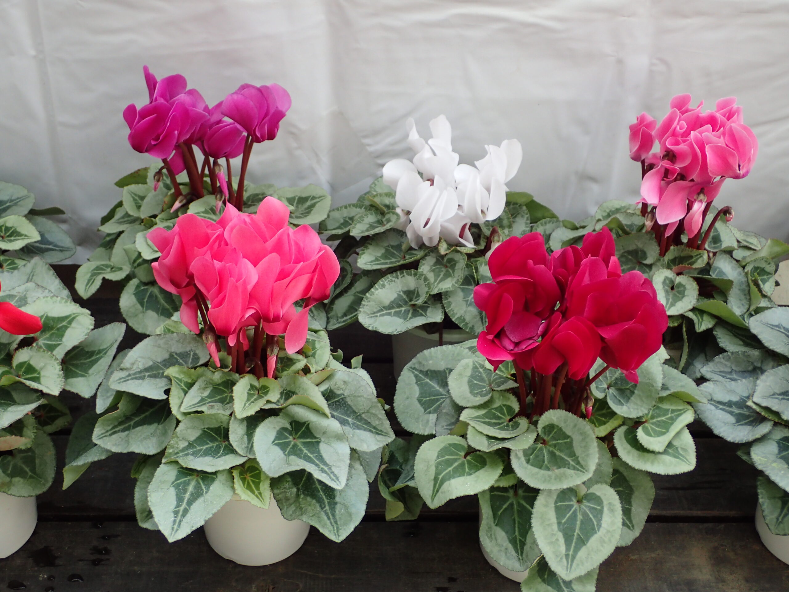 冬の鉢花の代表でもあるシクラメンの様々な花色や花姿がそろいました。