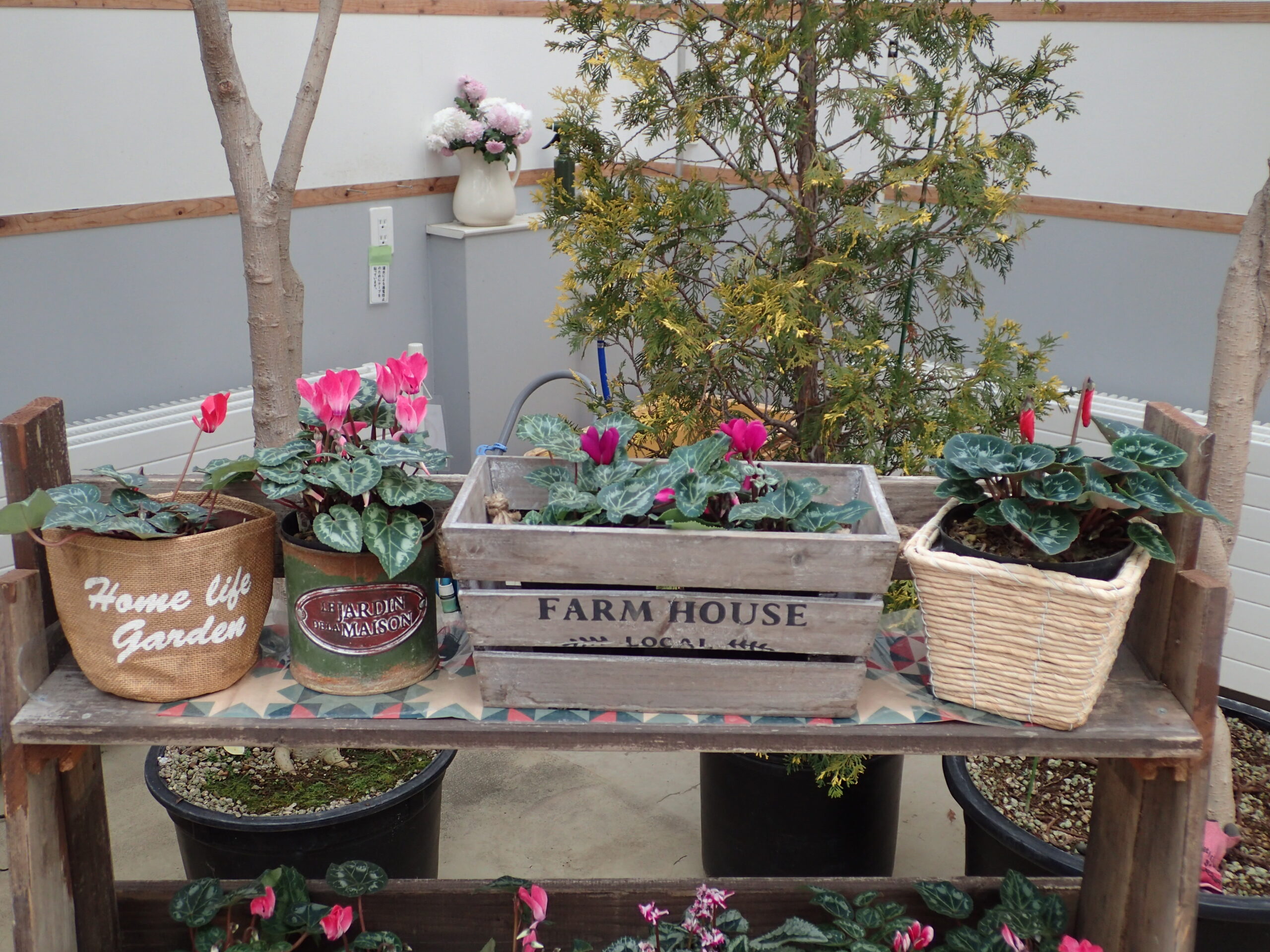 鉢や鉢カバーで変化を付けたシクラメンの展示