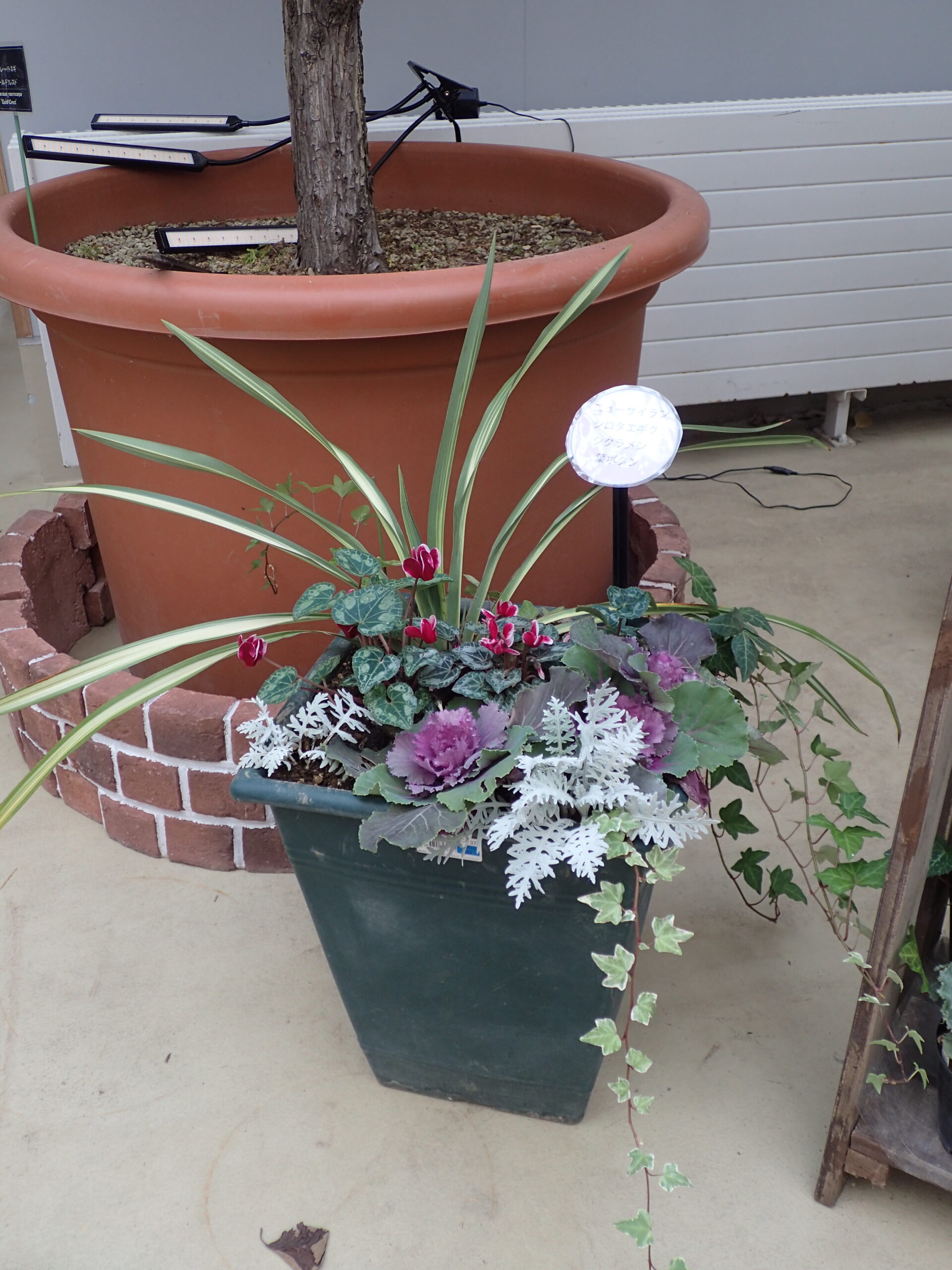 寒さに強い植物の寄せ植え。シクラメンがかわいらしさを演出しています。