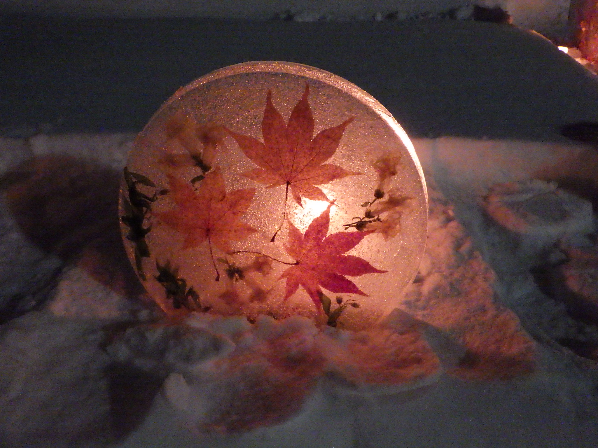 落ち葉と花のアイスボード。丸い形の氷の板の中に押した落ち葉や押し花、ドライフラワーなどを入れてあり、ボードの後ろにろうそくの灯りが見える