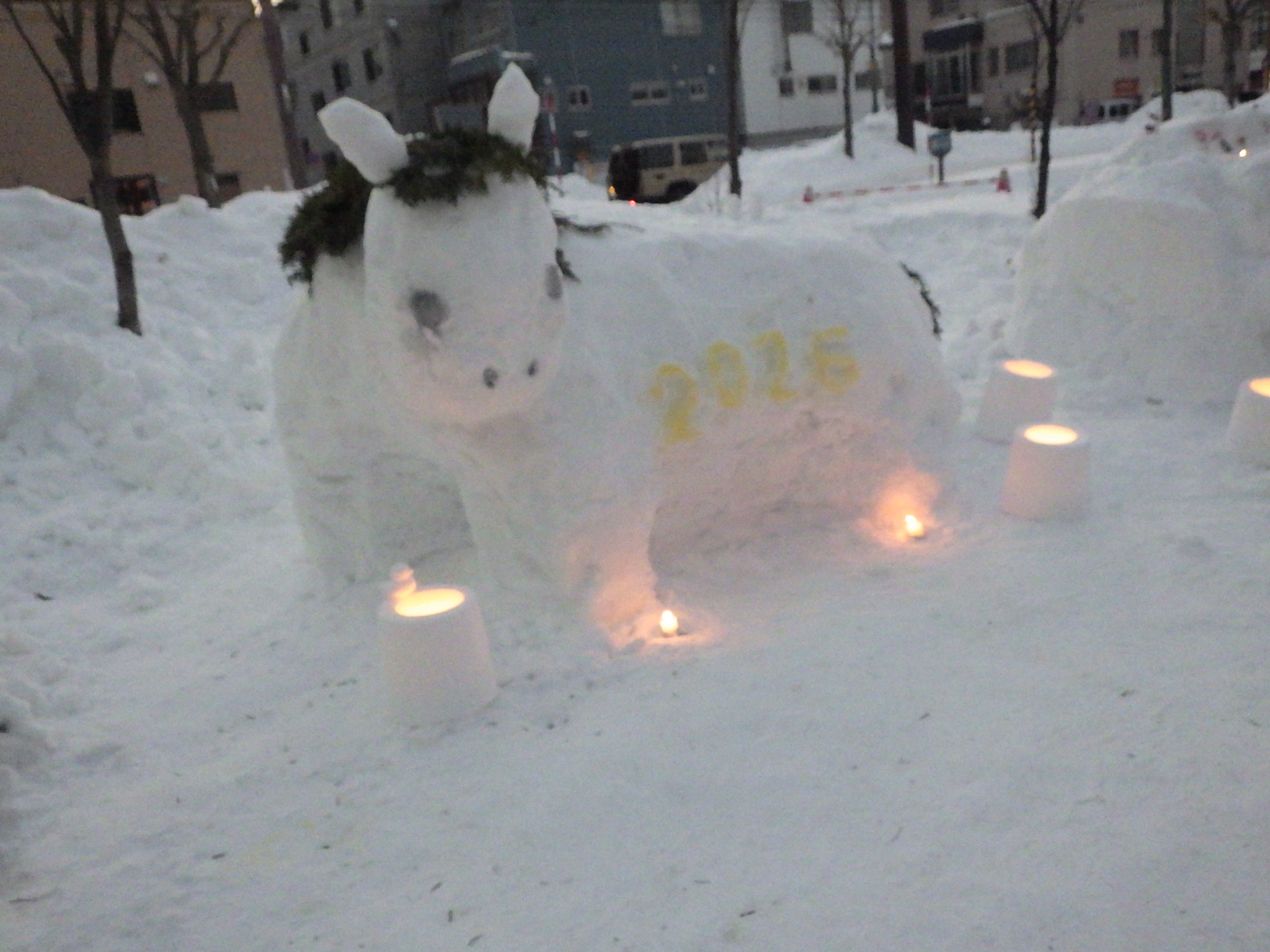 雪の塊に彫ったこりんとめーたん。それぞれに色がついている