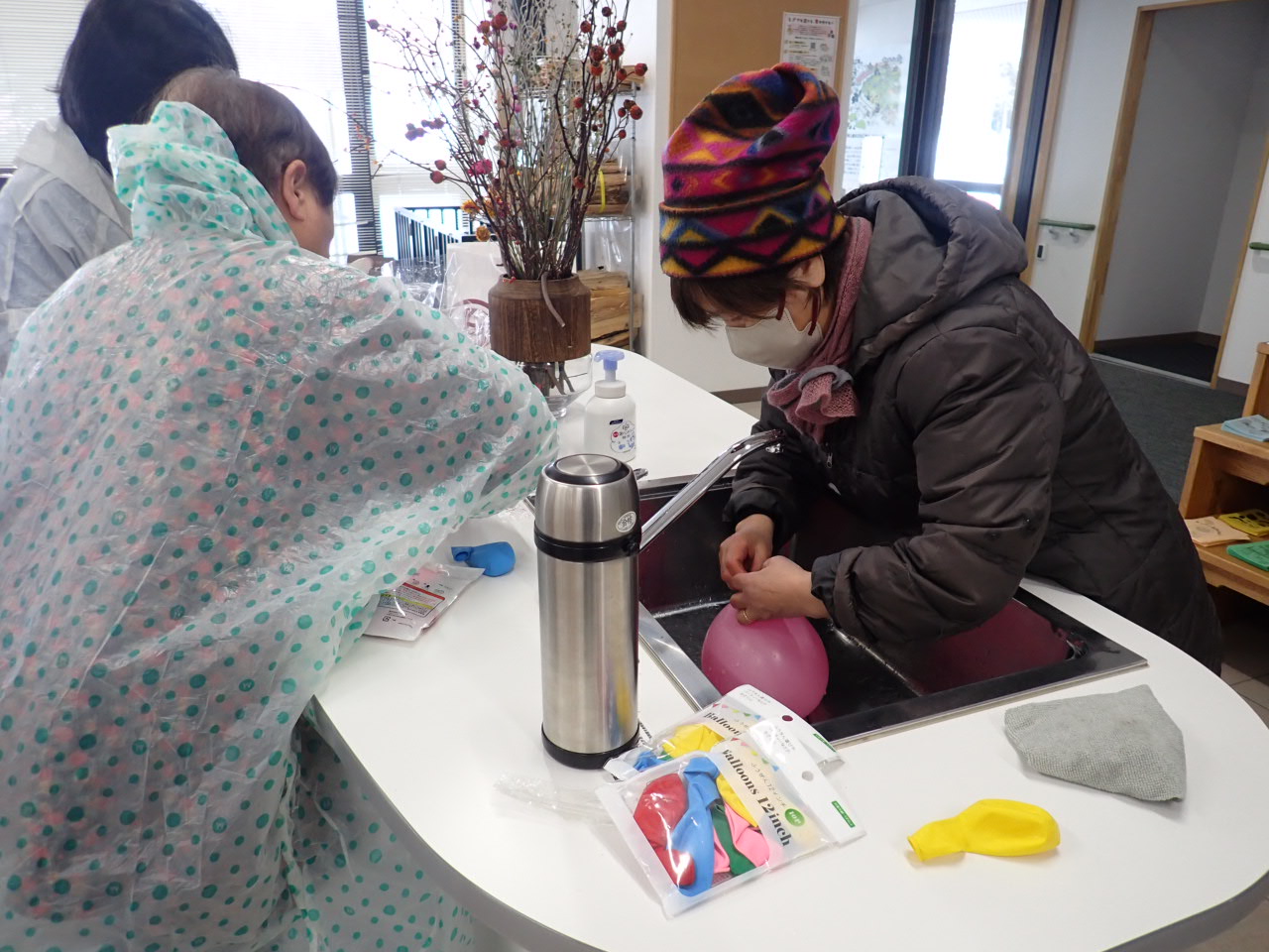 ボランティアの皆さんがつくったお花や植物が入った氷や風船で作った