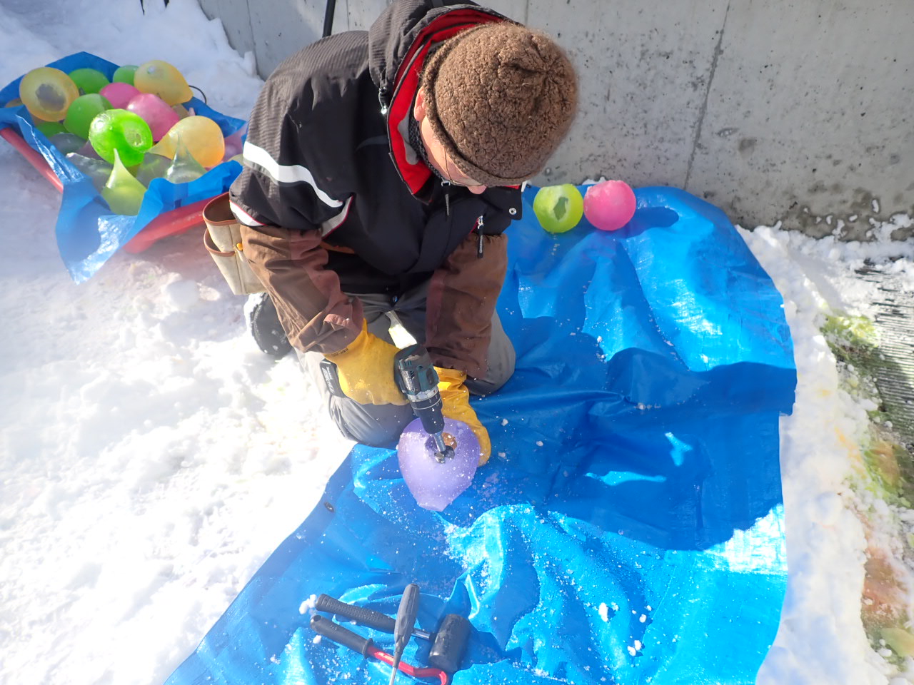 ボランティアスタッフたちと一緒にスノーキャンドル作り。雪を入れて
