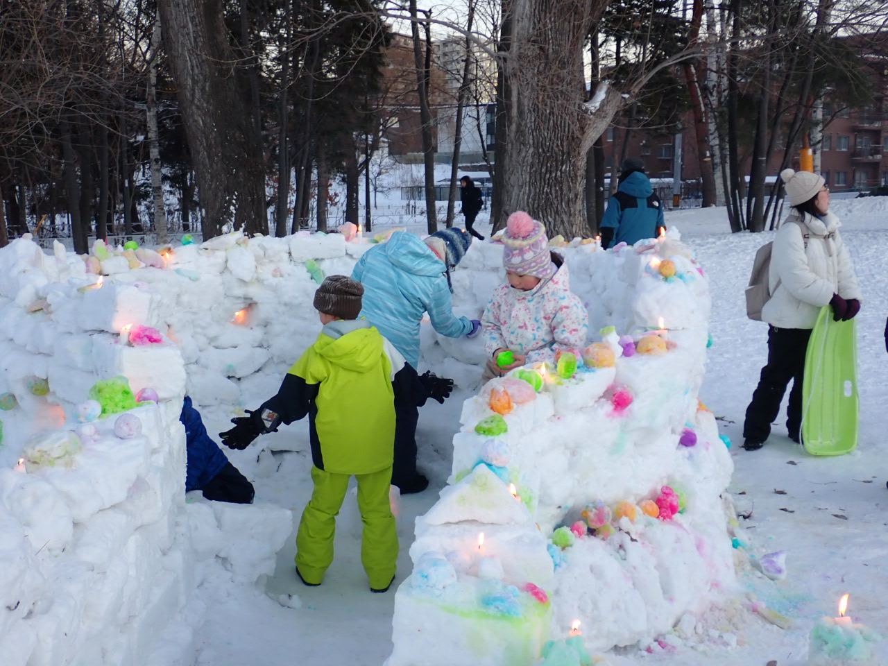 冬の月寒公園多目的広場で楽しい雪あそび。自分で作った