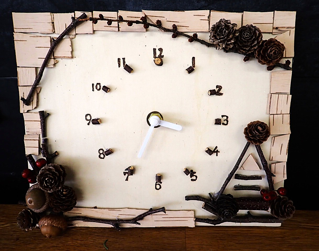 文字盤をバーニングペンで描いて、公園の自然素材で飾り付けします。