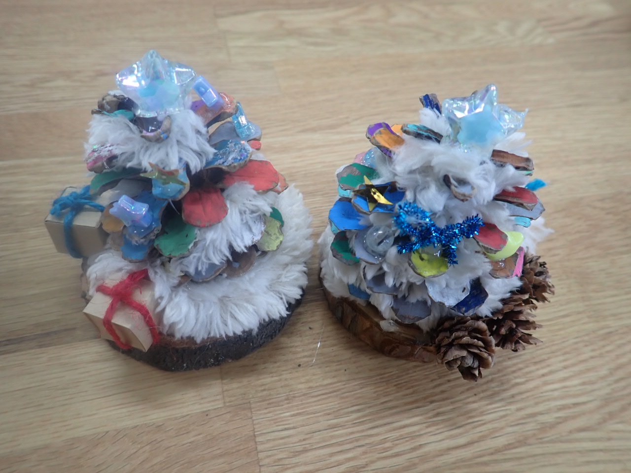 大きなまつぼっくりツリーでした。ポスカで色を塗ってから、毛糸やビーズで飾り付け。