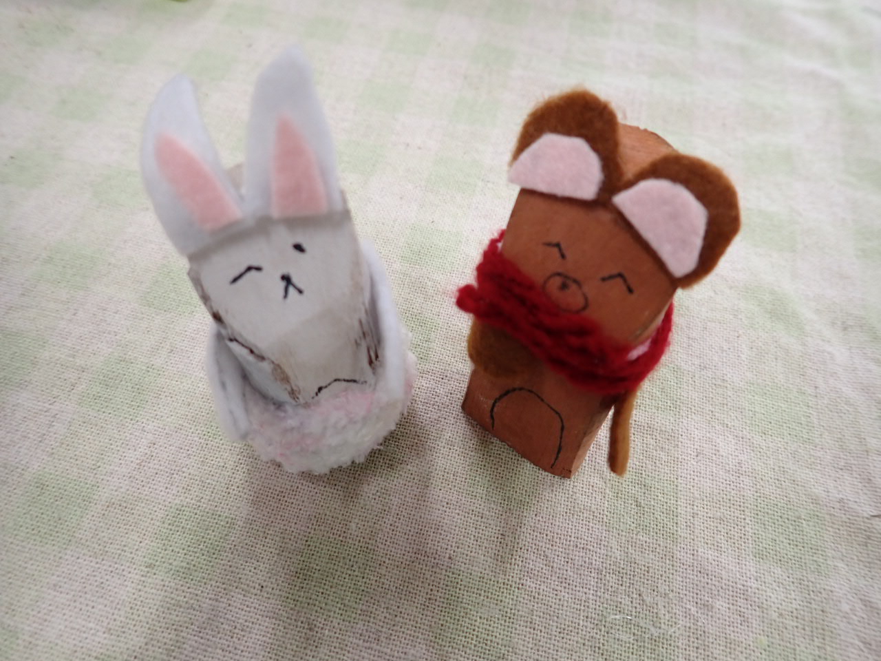 6cmほどの長さの木にペンや毛糸、フェルトを使ってマスコットを作りました。