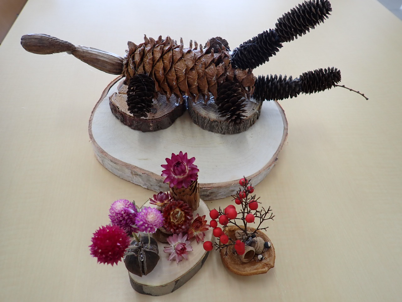 キツネや犬、カブトムシ、まるで華道のようにお花をいけてみたり、ウサギも…。口は?耳は?身体は?どの木の実作ろうかな?
