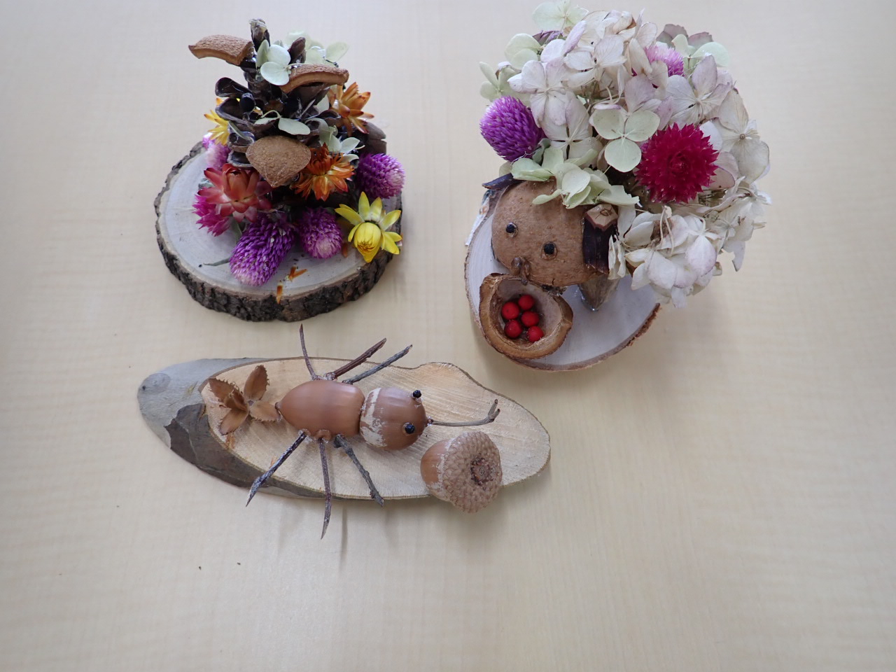 みなさん木の実でスイスイと製作。可愛らしい部分、リアルな部分をまじえながら