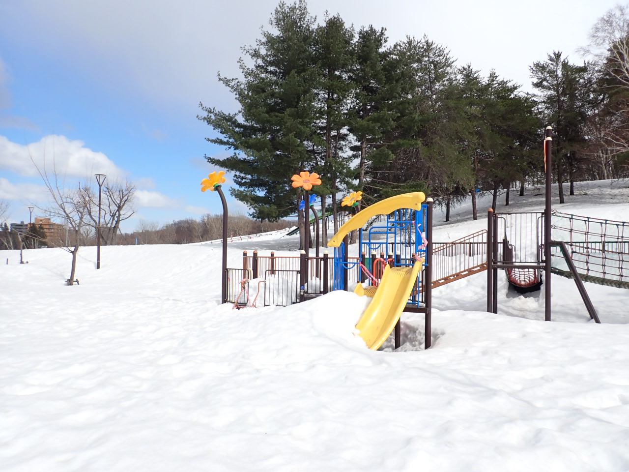 まだまだ雪が…。遊具のまわりは雪が深いところがあり、突然足元が埋まることが