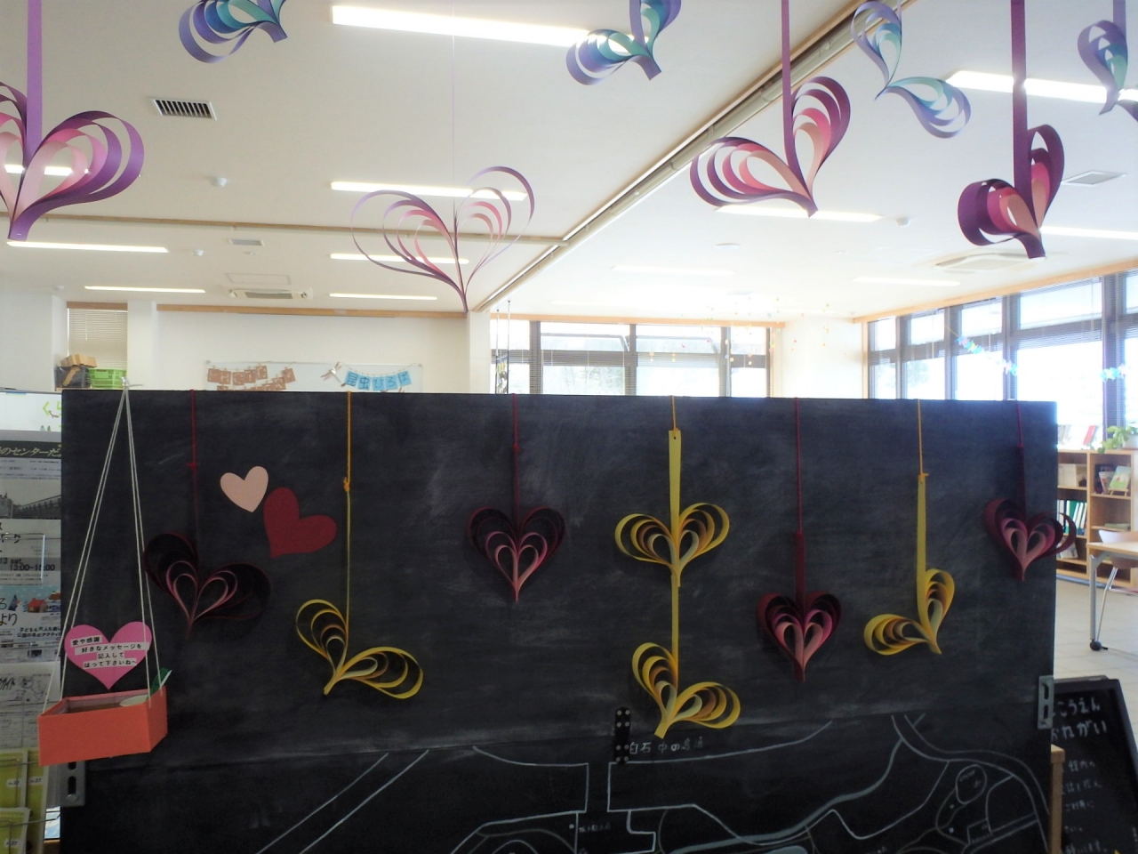 パークライフセンターの飾り付けを新しくしました。2月なのでバレンタインです。