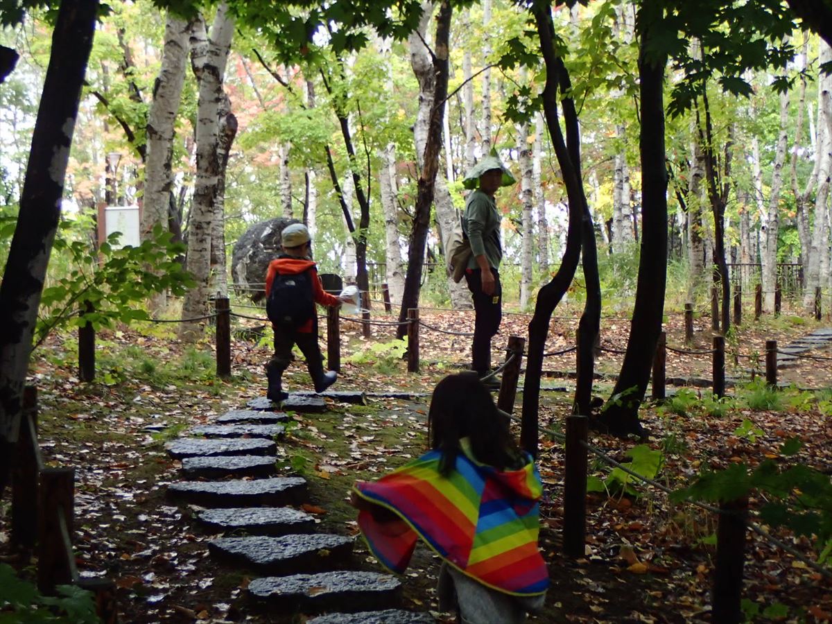 今回の講師は、「ネイチャーエデュケーション(みくに出版)」の著者である長谷部雅一さん。遠く東京から月寒公園に来てくれて、ちいさい子どもたちと一緒に秋を探しにでかけました。
