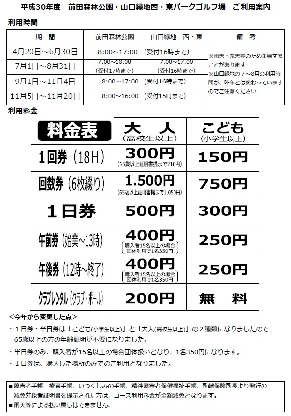 平成30年4月20日から、山口緑地パークゴルフ場西コース・東コースをオープンいたします。 今年は1日券と半日券の料金区分・料金等の変動がございますので、ご確認のほとよろしくお願い申し上げます。