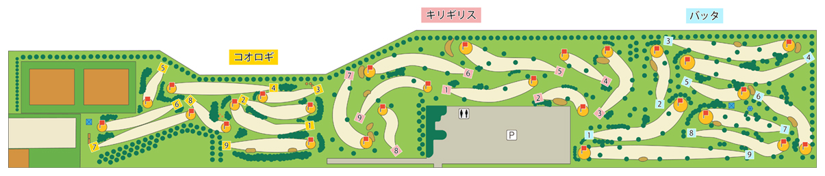 コオロギコース、キリギリスコース、バッタコースの3コース27ホールがあります。