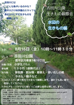 吉田川公園生きもの観察会~水辺の生きもの編参加者募集! 公開 2019年6月30日 · 更新済み 2019年7月14日 吉田川公園の横を流れる吉田川。 細くて小さい川だけど、どんな生きものが棲んでいるか、知っていますか? 夏休み最後の金曜日、さけ科学館のスタッフと一緒に、 川に棲む生きものを観察してみませんか? 参加ご希望の方は、 ①氏名 ②電話番号 ③学年をメールにて tsukisamu@sapporo-park.or.jp までお申込みください。 皆様のご参加をお待ちしています! シェアする