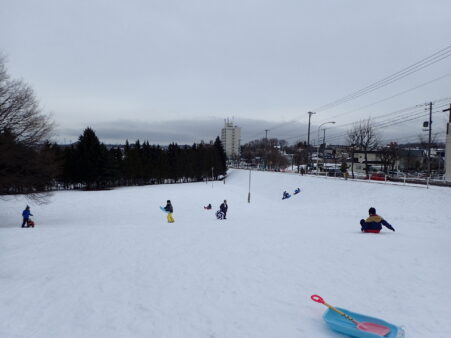 北野通の横にある広々とした斜面では、雪を待ちわびた子どもたちが、そりすべりを楽しんでいます。