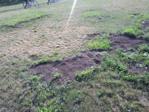 カラスの仕業です・・・ 2012年8月7日 公園のなだらかな斜面地の芝生が所々、めくれてしまっています・・・。 これは、カラスが芝生をめくって、中にいる虫を食べていたせいです。 めくったら、戻してくれればいいのに!! 戻してくれないので、養生のために黒土が入れてあります。 はやく芝生が回復してくれるといいのですが・・・。 シェアする