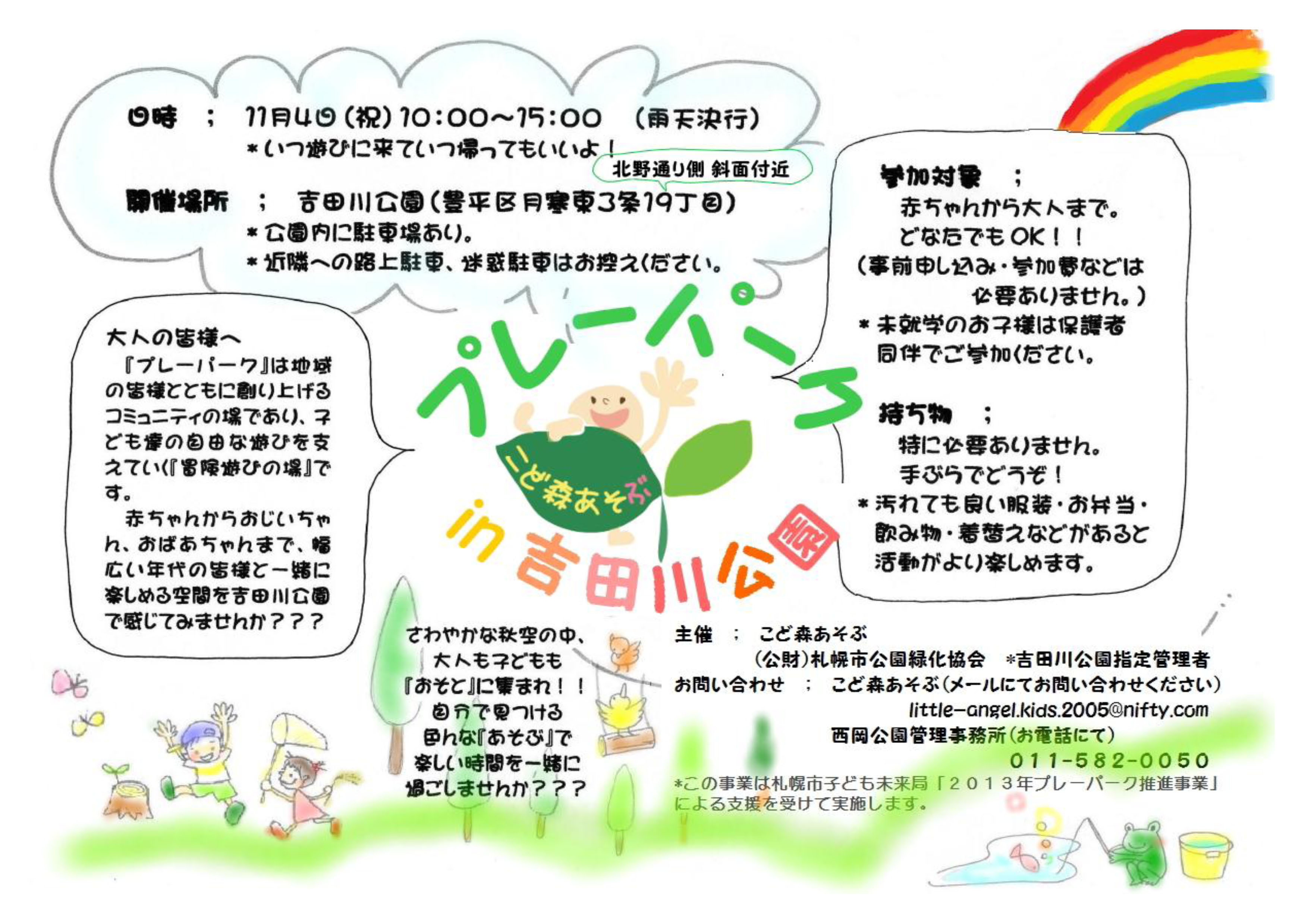 ※この企画は、プレーパーク活動団体「こど森あそぶ」と、吉田川公園の指定管理者(公財)札幌市公園緑化協会の共催で、札幌市子ども未来局のプレーパーク推進事業の一環として、実施いたします。