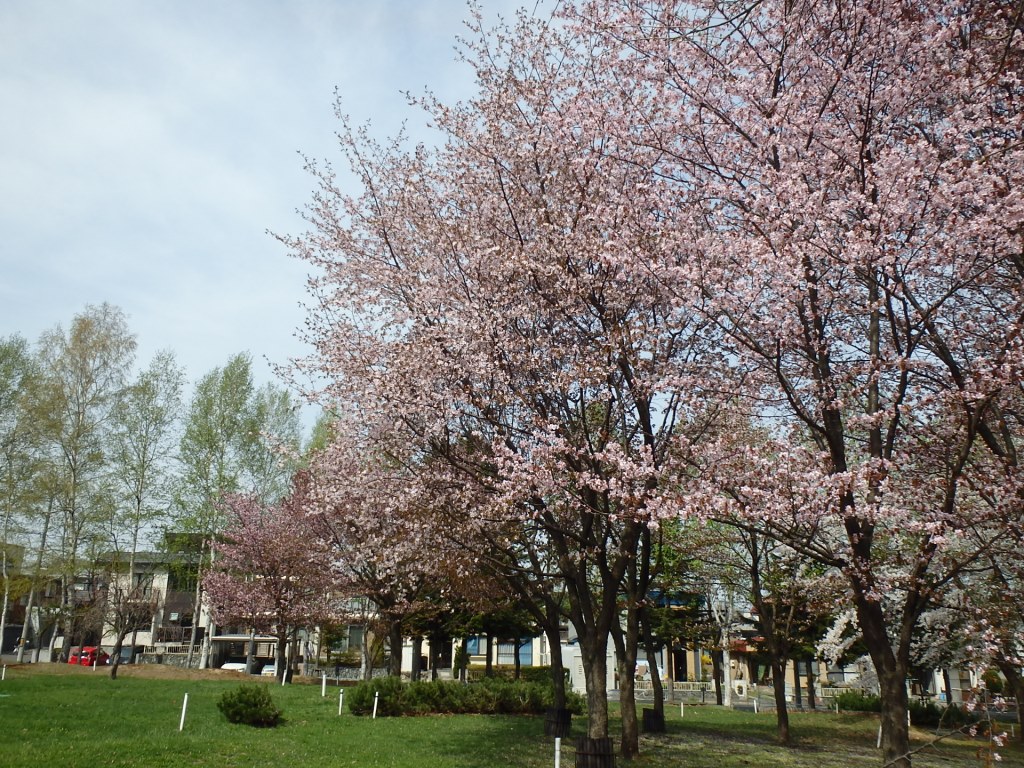 サクラが満開です! 2015年5月1日 例年にない暖かい日が続いていますね。 ゴールデンウイーク前半だというのに、 もうサクラが散り始めているところが多い札幌です。 でも、ここ吉田川公園では満開のサクラが見られます。 北野通りに面しているところは、ほぼ散ってしまいましたが、 パークゴルフ場のサクラは満開です! こちらの枝は低く伸びているので、 こんなに間近に見ることができますよ。 雨が降る前に、ぜひ見に来てくださいね! シェアする